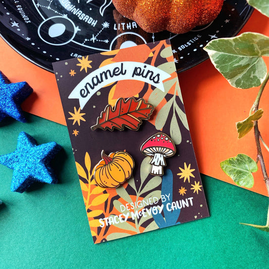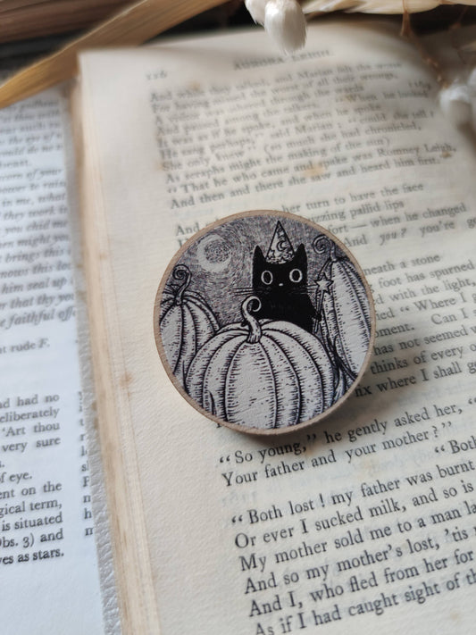 Pumpkin Wizard- Black Cat Wooden Pin Badge