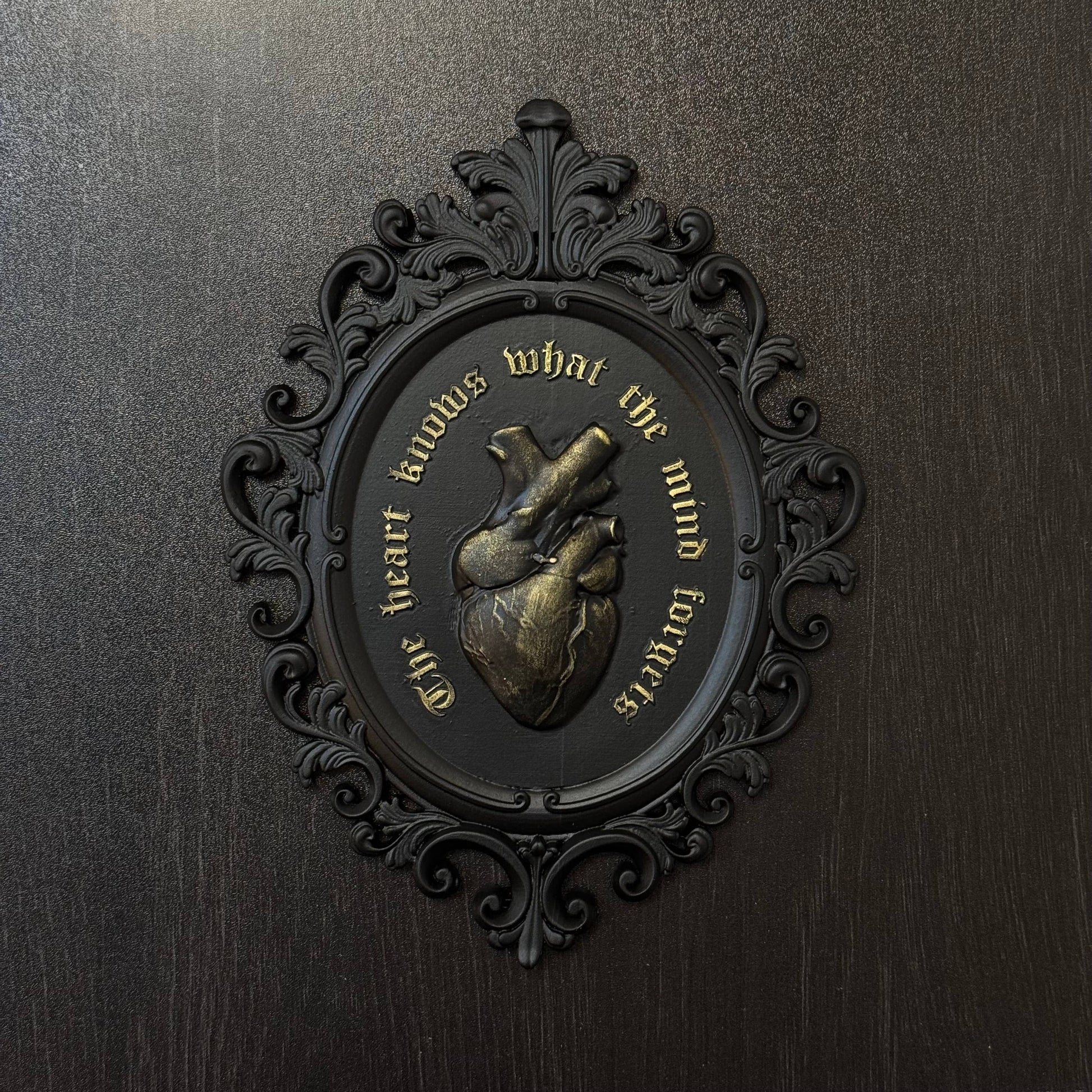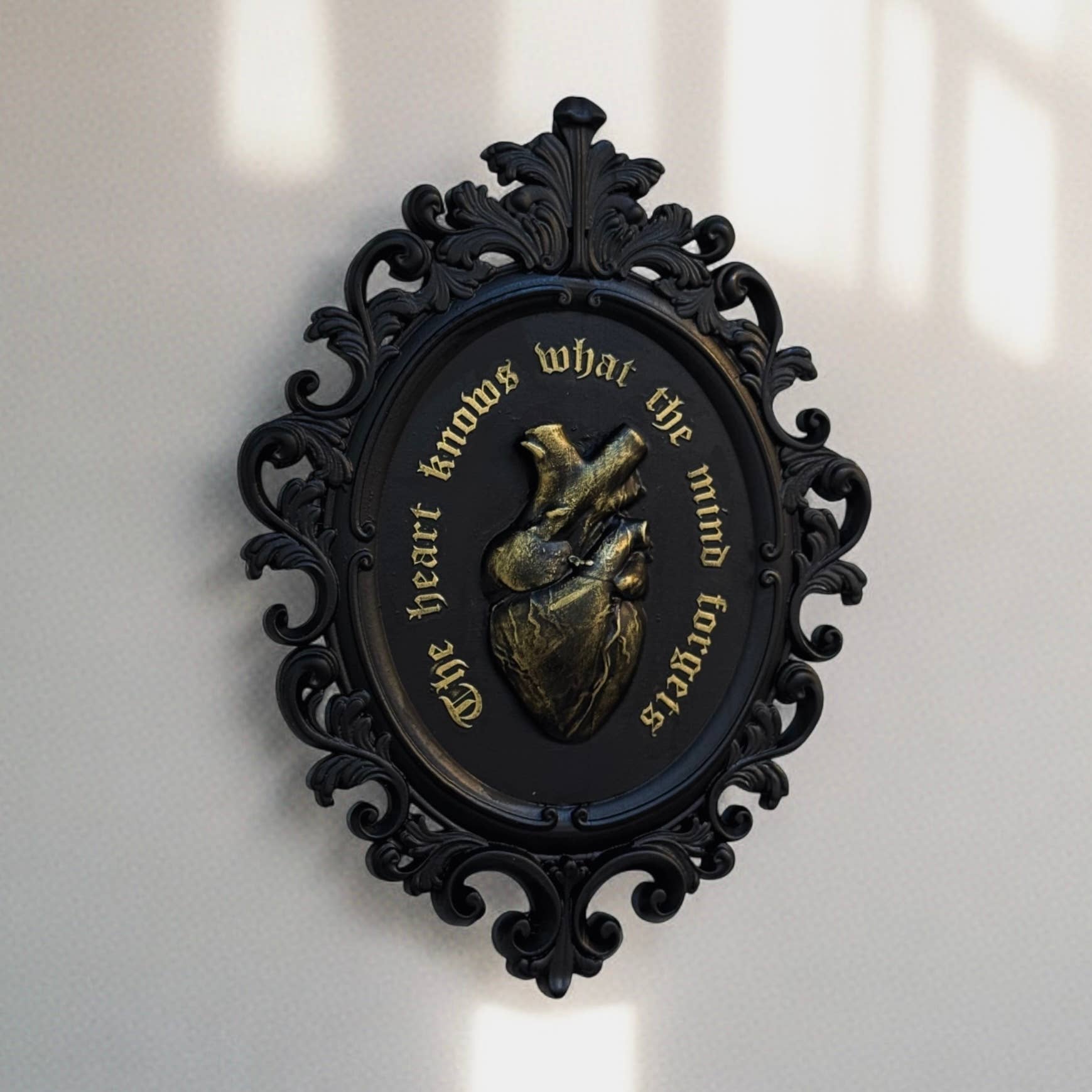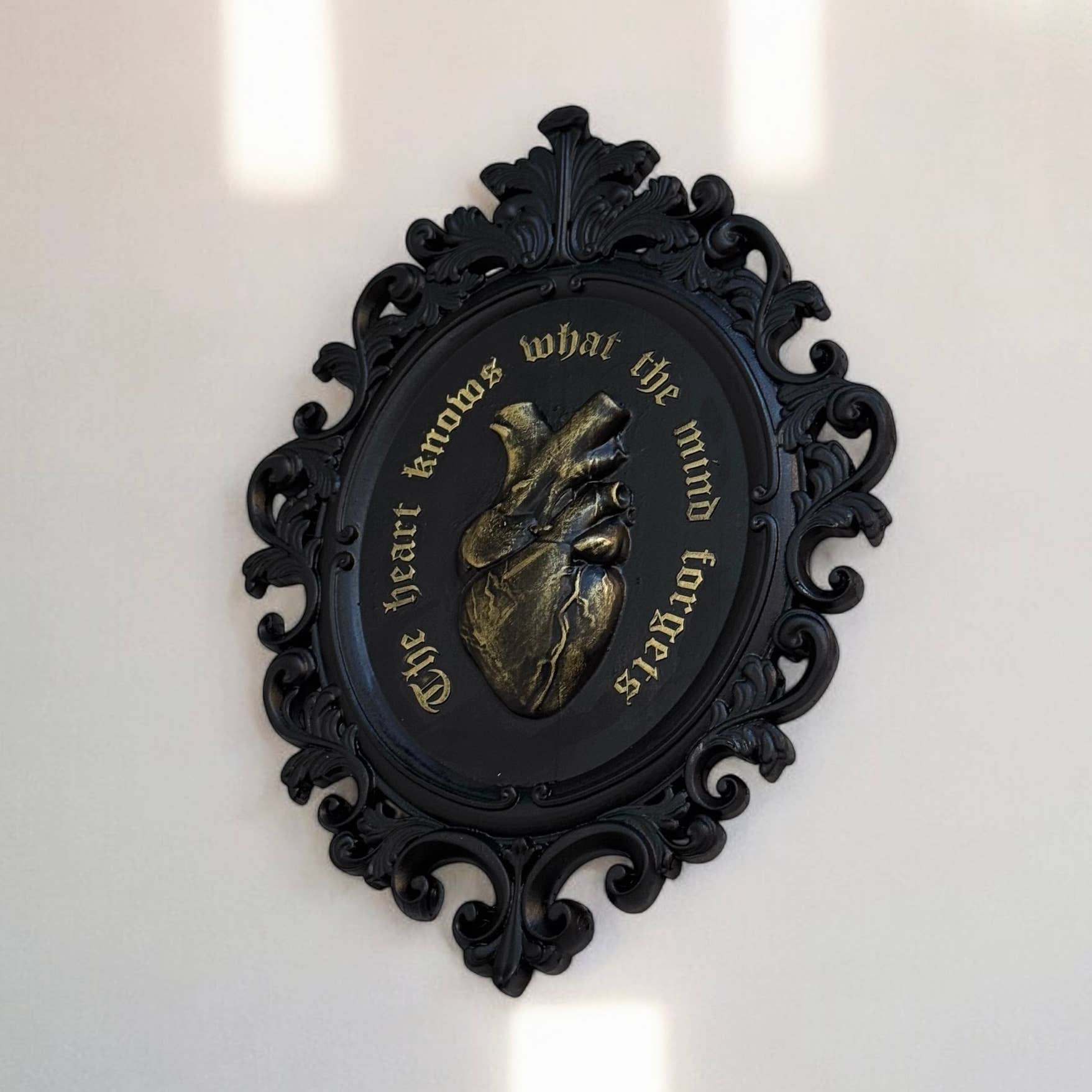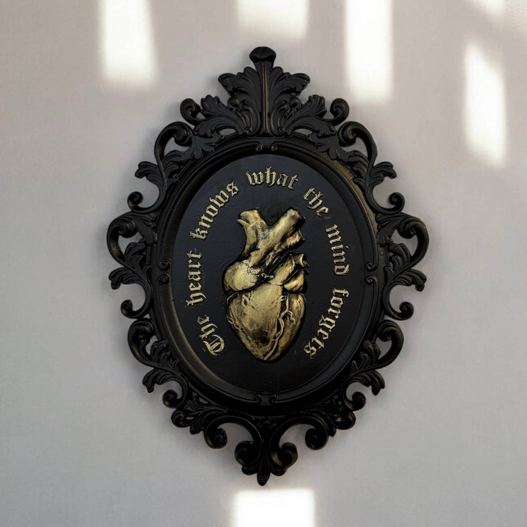 "The heart knows what the mind forgets" Set in a black ornate baroque-style frame, this 20 x 15 cm artwork is ready to hang and perfect for those who love dark romantic aesthetics, alternative decor, or unique handmade art.