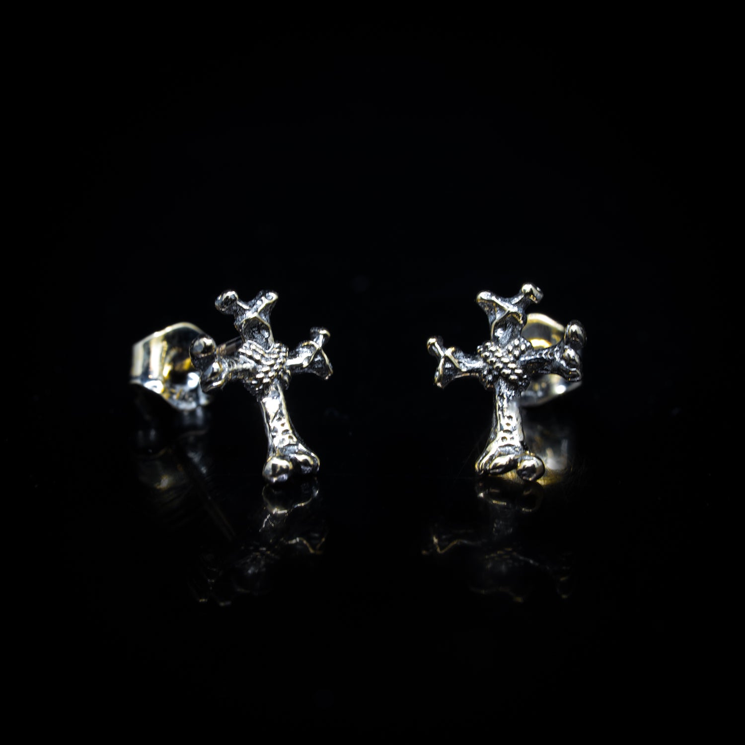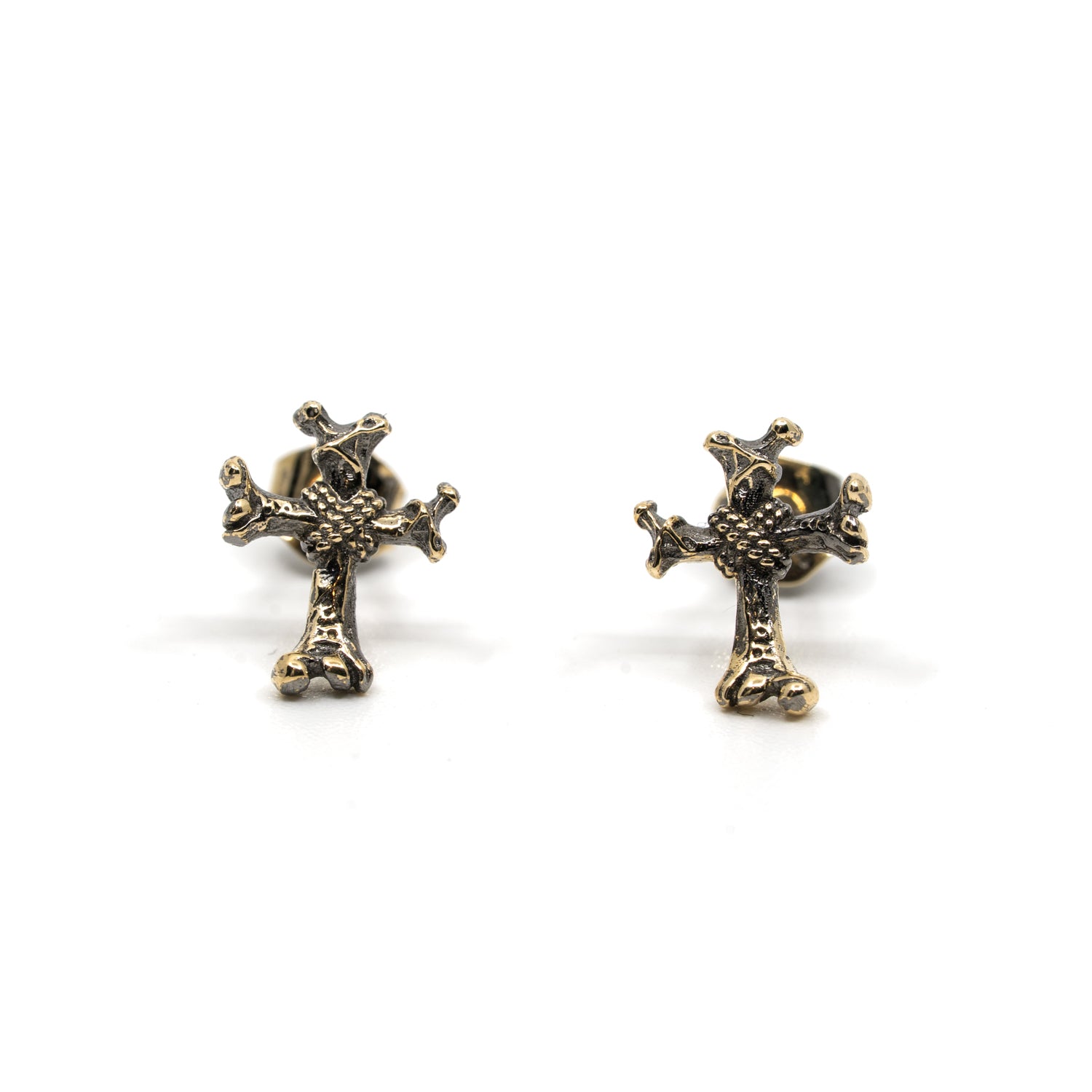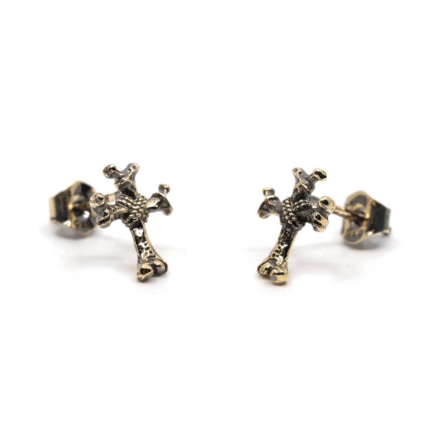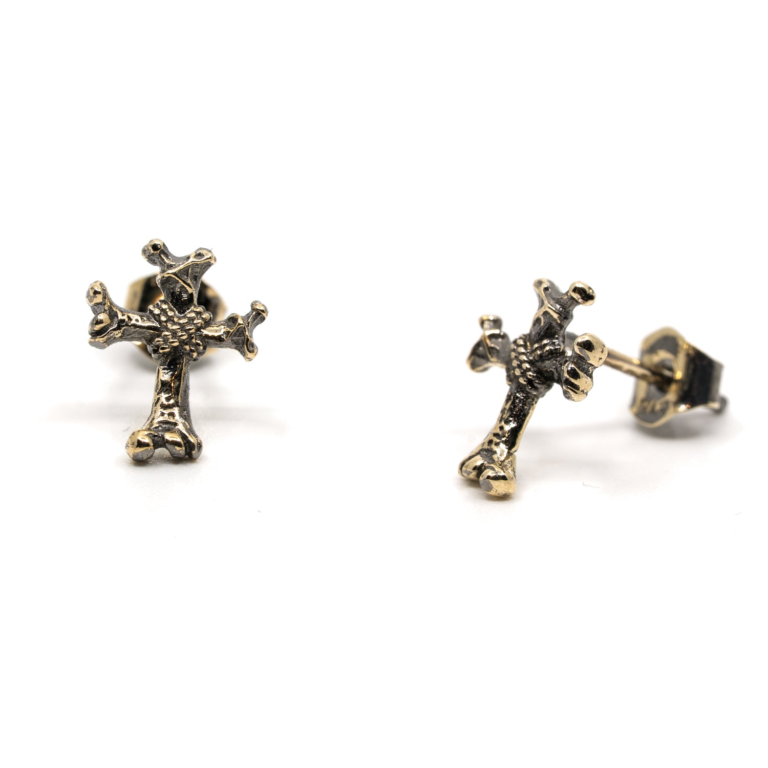 The Apostate. They are crafted in 9ct gold, with two femurs interconnected and designed to look entwined in a rope to create the cross.