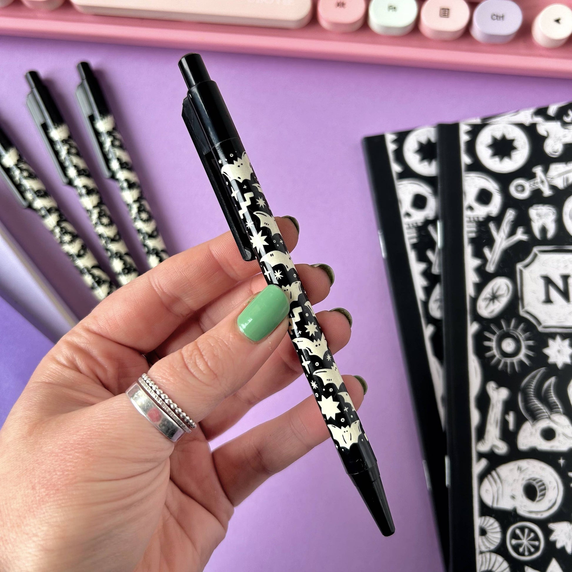 A black ballpoint pen, with my bats and stars pattern wrapped all the way around.
