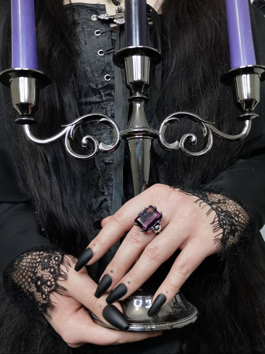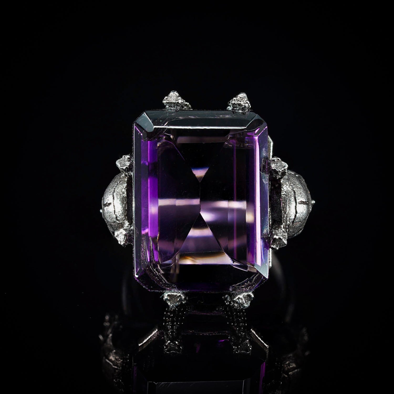 If you're looking for a women's alternative to a standard bulky skull ring, look no further. Inspired by the Sedlec Ossuary, adorned with a luxurious 15x20mm Amethyst, two broken skulls and a unique vertebrae claw settings, all crafted from 925 sterling silver. A true statement piece!