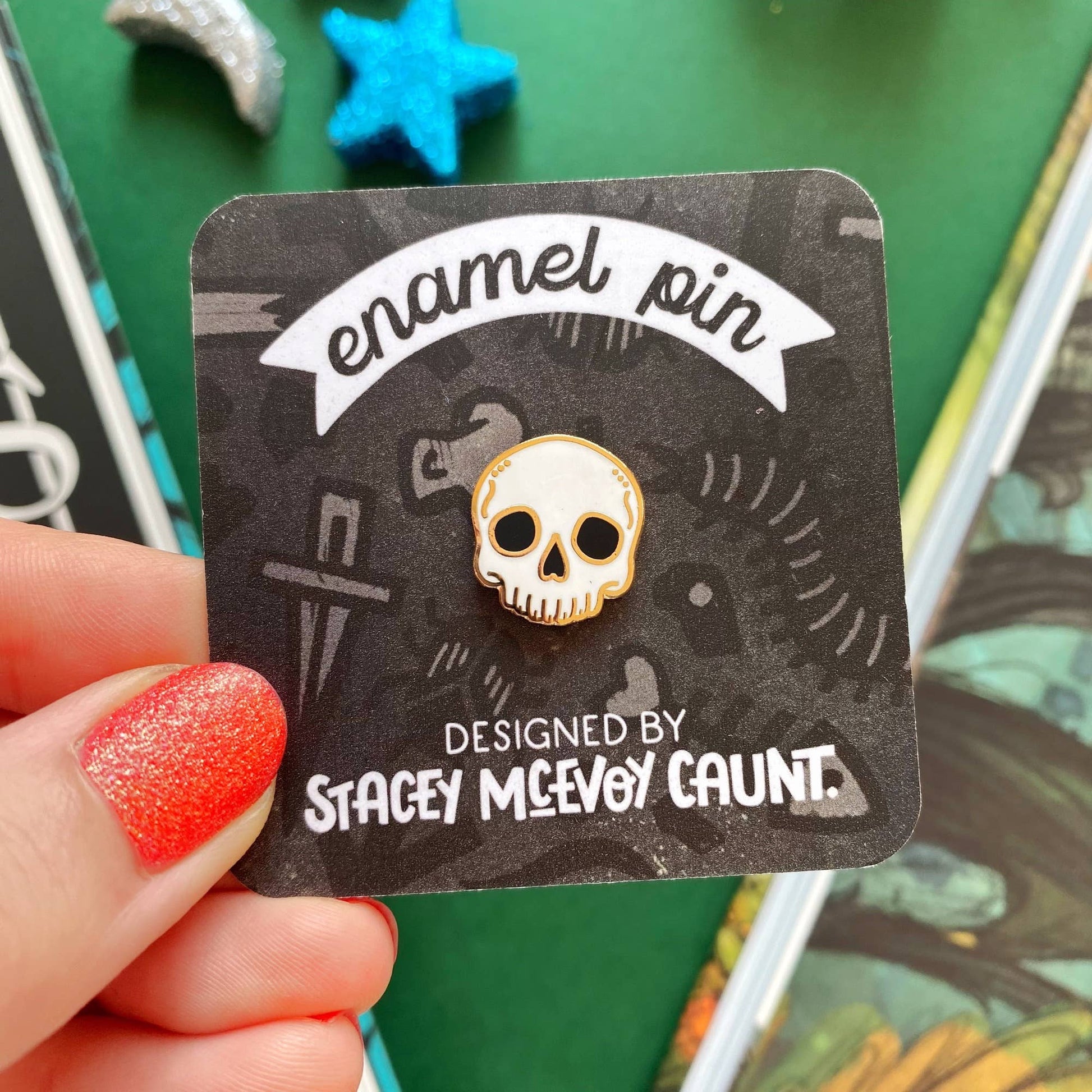 A little spooky skull enamel pin.