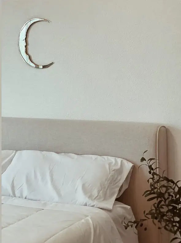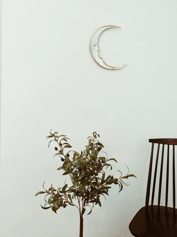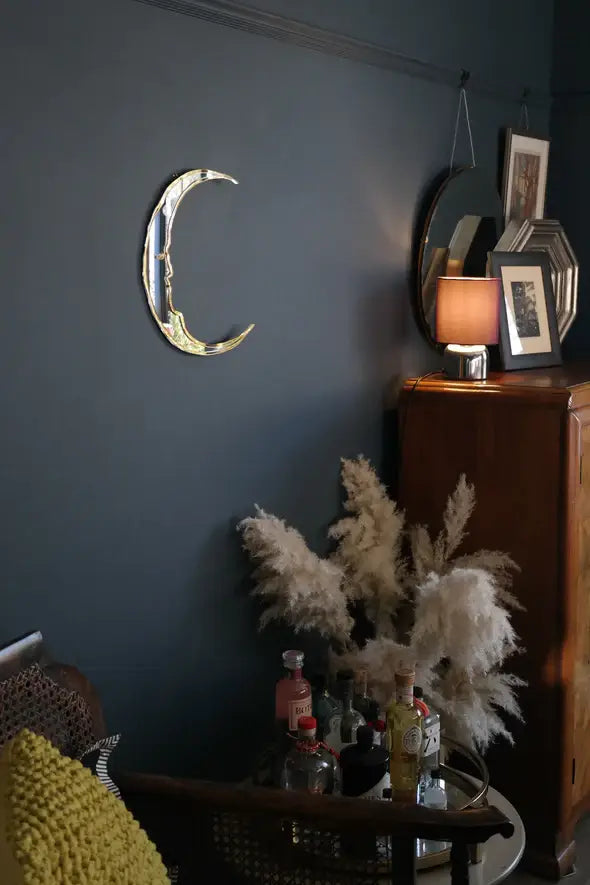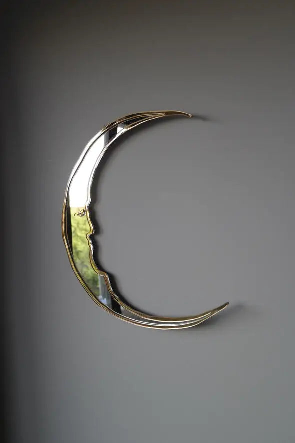 Elevate your inventory with this stunning wall mirror that will captivate your customers. This unique mirror features a silver crescent moon framed with gold mirror detailing.
