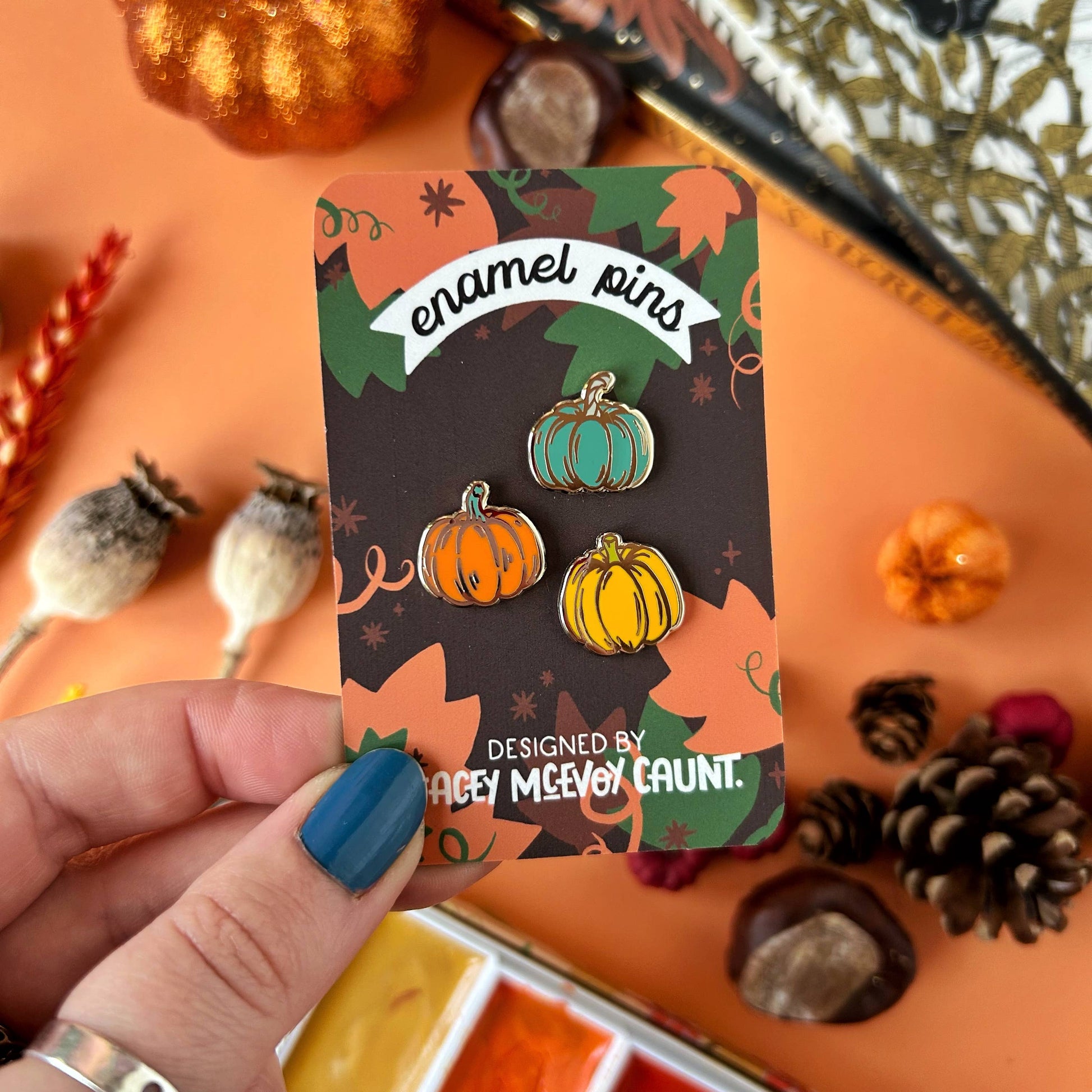 A Halloween themed set of three little pumpkin enamel pins. One orange, one teal and one a lighter orange.