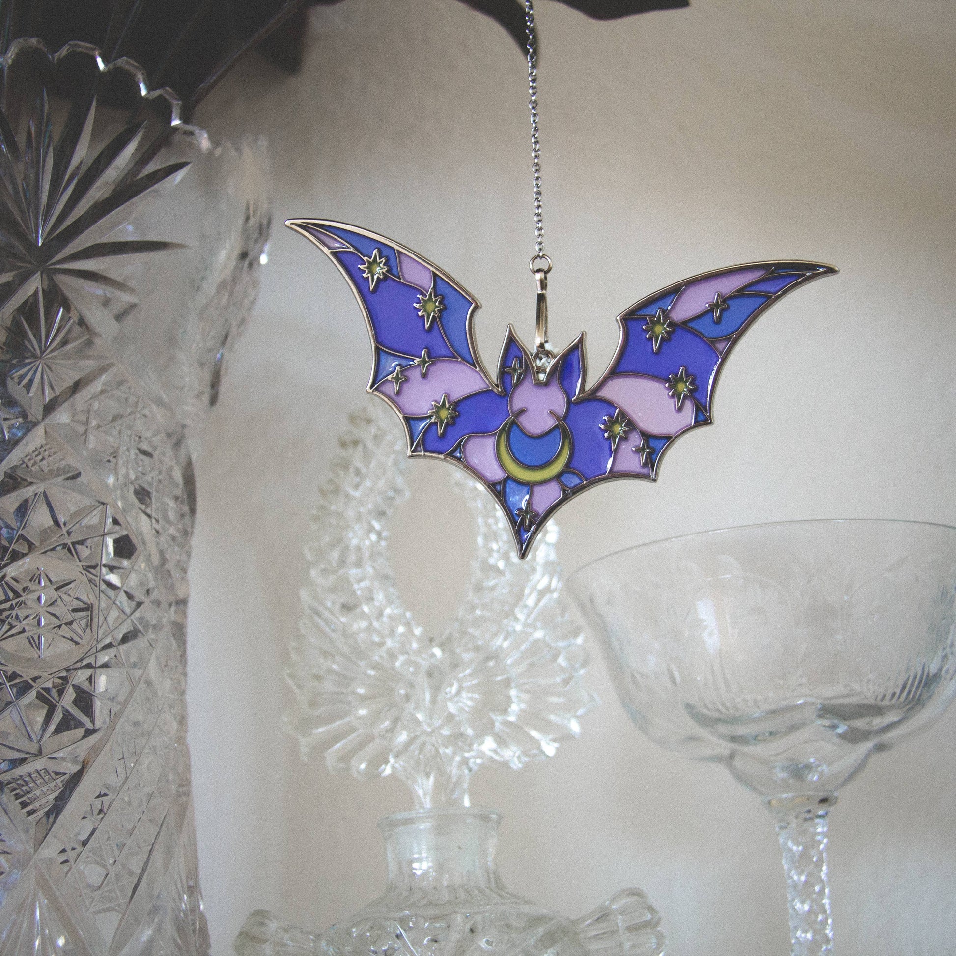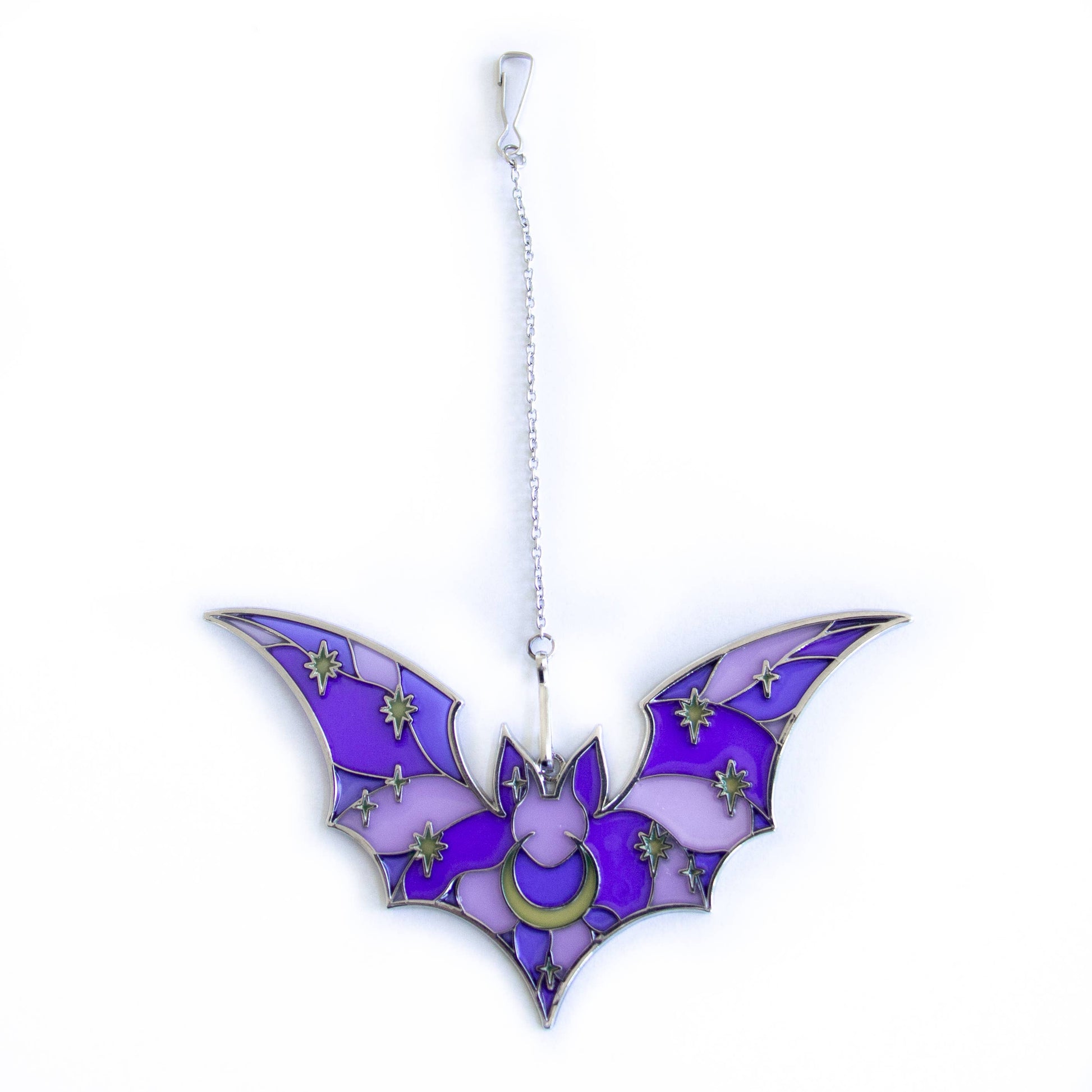 Ornament measures approximately 4.5" x 2.5". - Hangs on a 5" removeable chain. - Silver metal with purple translucent enamel for a stained glass effect. - Designed by Ectogasm. This enchanting ornament features a purple stained glass bat dotted with yellow stars and a moon. Hang it in your window with a small suction cup to use it as a festive suncatcher for Halloween. When the fall season ends, swap out its chain for a hook and use it as an ornament on your Christmas tree. Design copyright by Ectogasm 2022