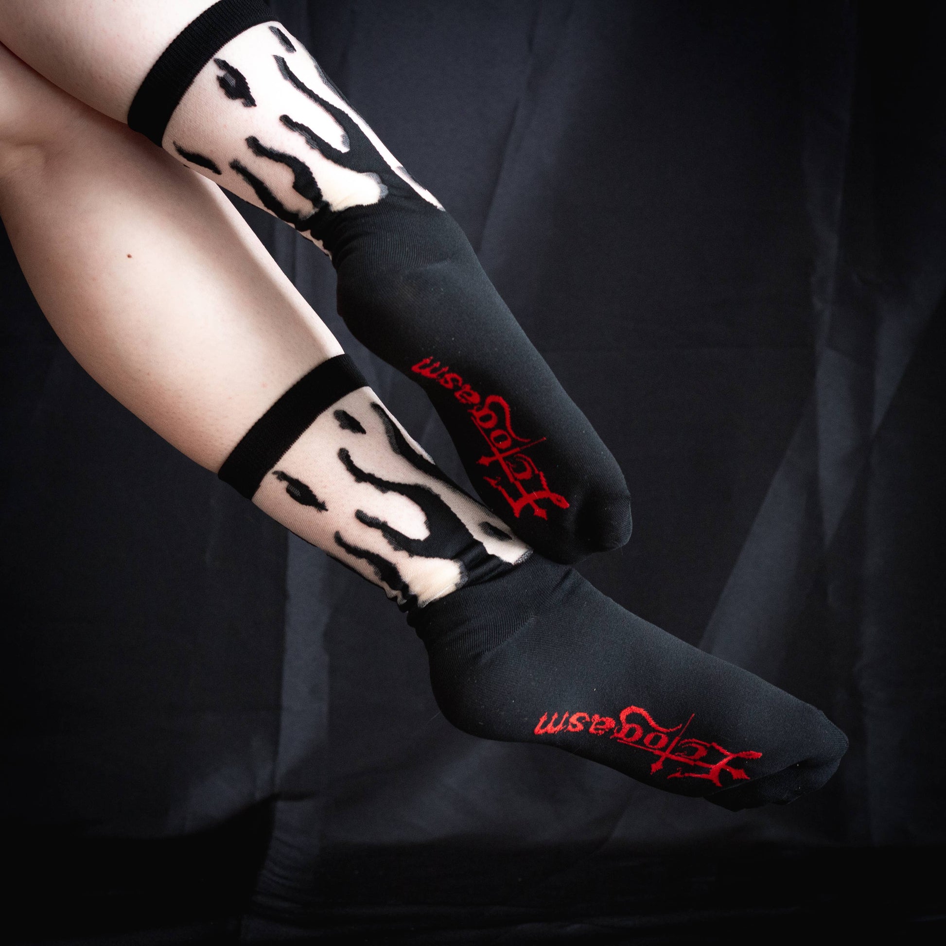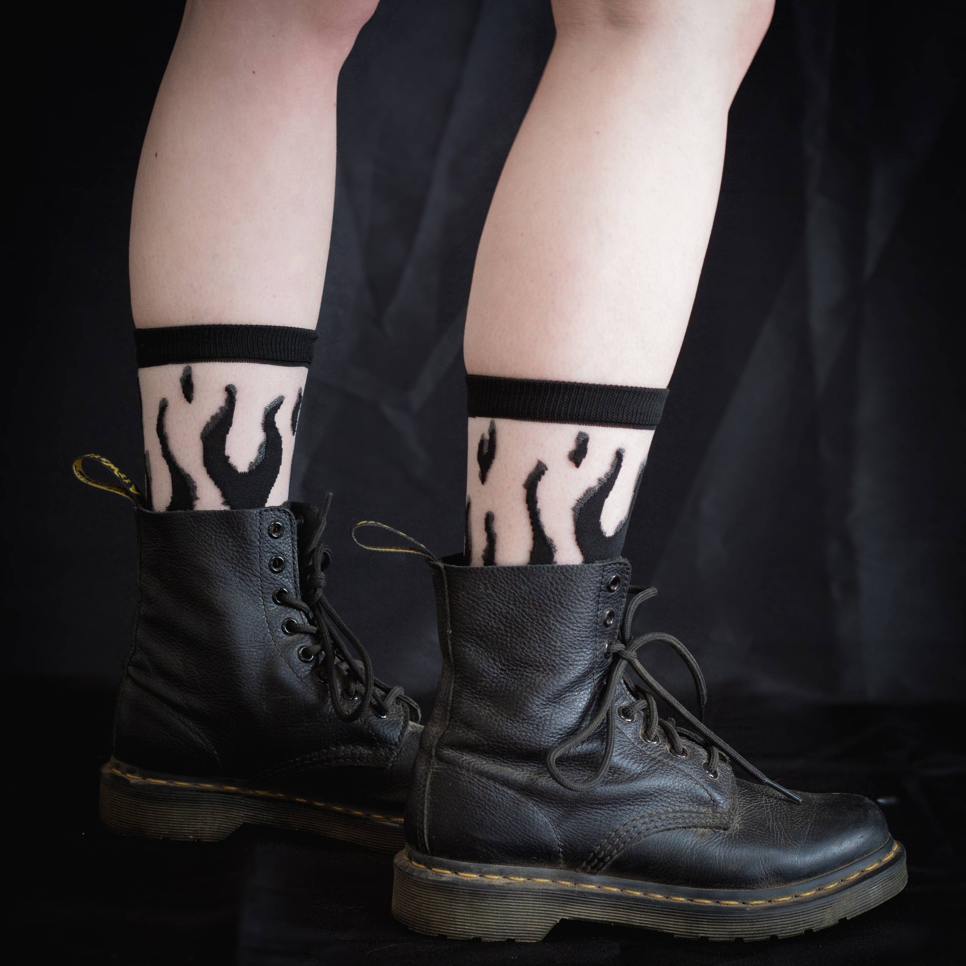 These cool socks feature a wicked black flame pattern. Woven over a sheer base, when you wear them, it looks like flames are coming out of your shoes! Wear with your favorite sneakers or boots for a unique alternative aesthetic.