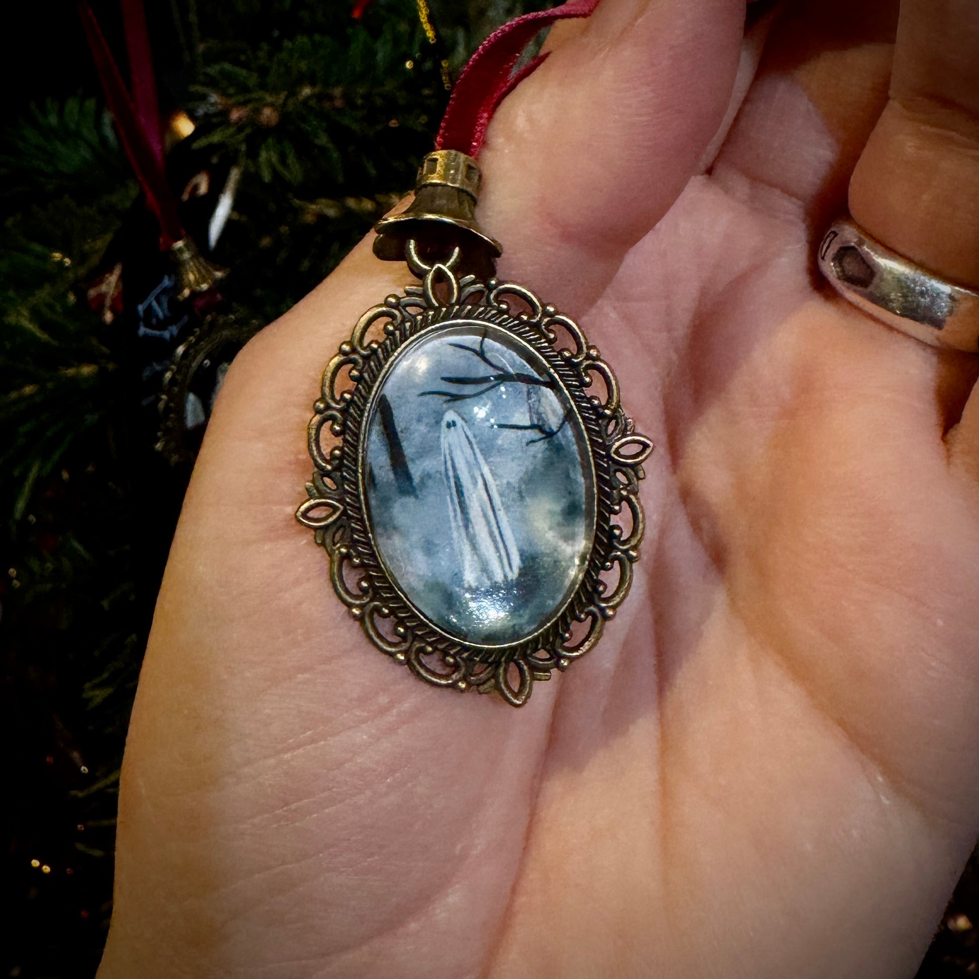 Festive gothic bauble handmade by Gray & Co featuring a miniature print of their original painting