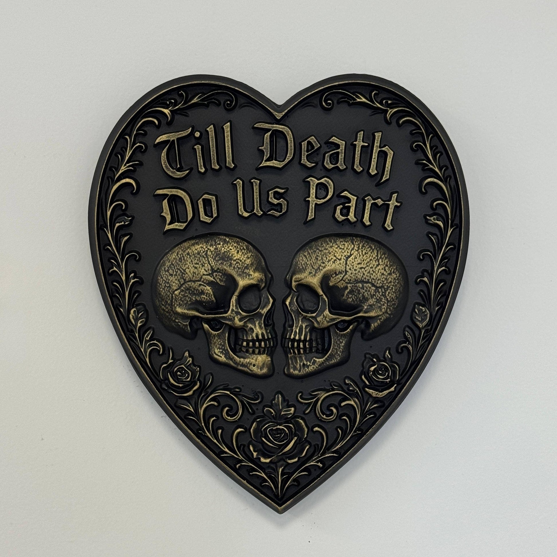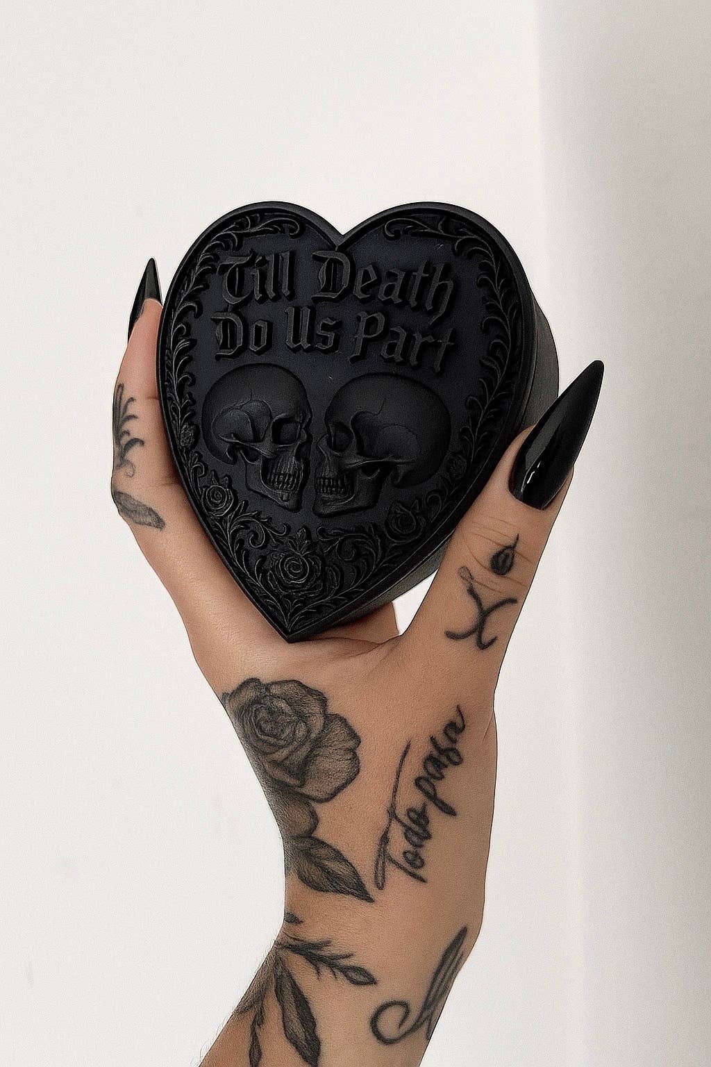 A striking statement piece for lovers of the dark and romantic. The G7T6 heart-shaped ring box is crafted with intricate detailing, featuring two skulls face to face beneath the script “Till Death Do Us Part.” The interior is perfectly sized for rings, earrings, or other small treasures, making it a unique engagement ring box, wedding keepsake, or valentines gift.